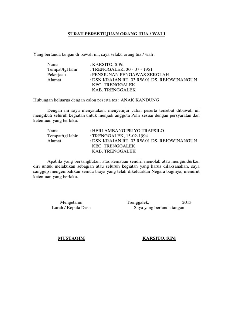 17 tahun harus menyampaikan surat pernyataan ijin orang tua dan hanya bisa berpartisipasi dalam lomba dengan kategori 5k, 10k, 17.8k (mohon lingkari kategori yang telah di pilih). Surat ijin dari orang tua/wali. Lesmana ari silalahi alamat : Nama umur pekerjaan agama : Ada banyak sekali jenis surat izin orang tua, baik itu untuk keperluan kerja, sekolah, kuliah, kegiatan organisasi dan masih banyak yang lainnya.